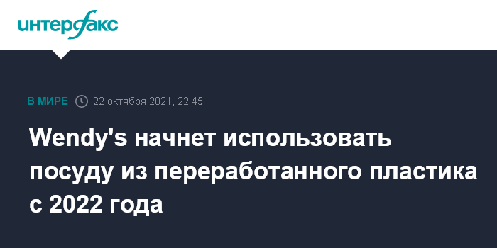 Москва. 22 октября. INTERFAX.RU - Сеть фастфуда Wendy's Co., третья по величине в США, сообщила, что в 2022 году начнет использовать посуду из переработанного пластика. Компания для этого заключила соглашения с Berry Global, производящей упаковку, и химической компанией LyondellBasell.