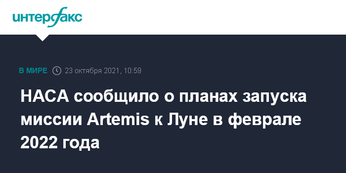 Москва. 23 октября. INTERFAX.RU - Предварительная дата запуска тестовой миссии Artemis 1 к Луне намечена на 12 февраля 2022 года, сообщило НАСА.
