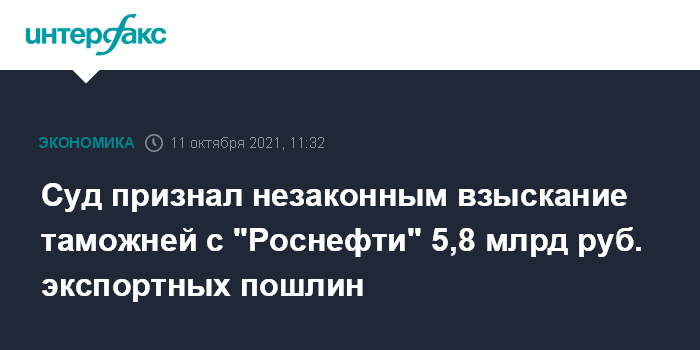 Суд признал незаконным взыскание таможней с "Роснефти" 5,8 млрд руб. экспортных пошлин