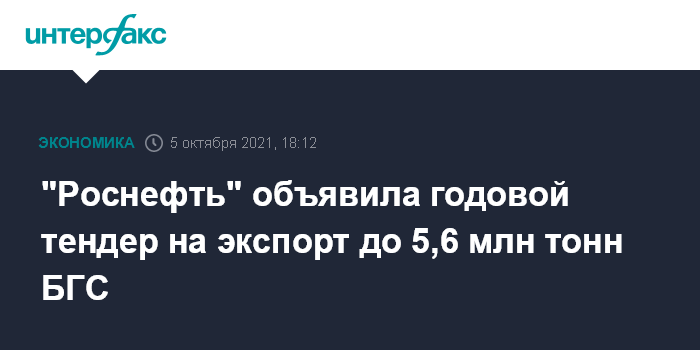 "Роснефть" объявила годовой тендер на экспорт до 5,6 млн тонн БГС