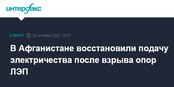 Москва. 24 октября. INTERFAX.RU - Афганские энергетики в воскресенье полностью восстановили электроснабжение в Кабуле и провинции, нарушенное после диверсии.
