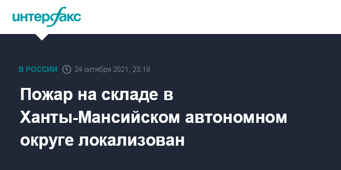 Москва. 24 октября. INTERFAX.RU - Пожарные локализовали крупный пожар на складе в Нягани (Ханты-Мансийский автономный округ), сообщили "Интерфаксу" в пресс-службе Главного управления МЧС по региону в воскресенье.
