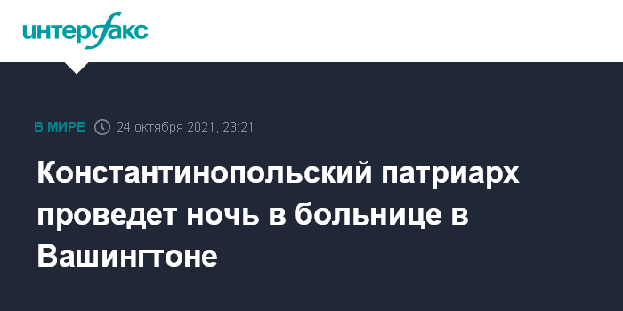 Москва. 24 октября. INTERFAX.RU - Патриарх Константинопольский Варфоломей проведёт ночь в одной из больниц Вашингтона, а утром, как ожидается, его выпишут, сообщает греческая православная архиепископия Америки.