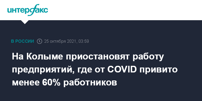 "В Магаданской области с 30 октября будет приостановлена деятельность предприятий, если численность работников, вакцинированных от COVID-19 составляет менее 60% коллектива", - говорится в сообщении.