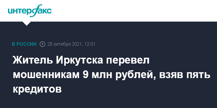 Житель Иркутска перевел мошенникам 9 млн рублей, взяв пять кредитов