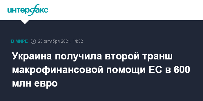 Москва. 25 октября. INTERFAX.RU - Украина в понедельник получила второй транш в размере 600 млн в рамках пятой программы макрофинансовой помощи Евросоюза, сообщило министерство финансов страны.