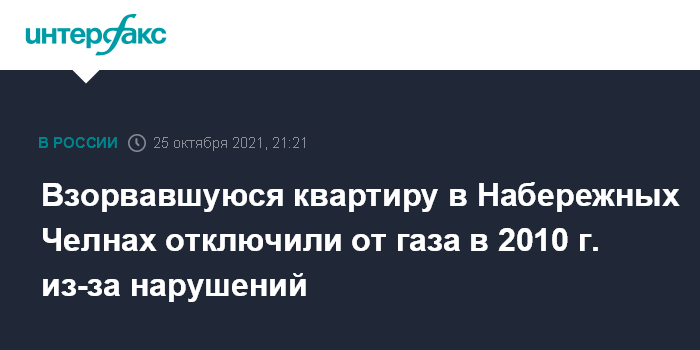 Москва. 25 октября. INTERFAX.RU - Квартира №162 в пятиэтажном доме в Набережных Челнах, где в понедельник произошел взрыв, с 2010 года была отключена от газоснабжения. Об этом сообщила пресс-служба ООО "Газпром трансгаз Казань".