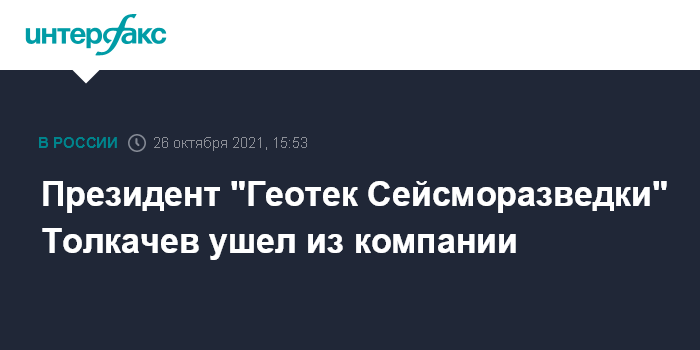 Как говорится в сообщении компании, полномочия Толкачева по его собственной инициативе были досрочно прекращены с 21 октября 2021 года. Новым президентом "Геотек Сейсморазведки" (с 22 октября сроком на год) назначен Николай Козлов, который с 2018 года занимал должность вице-президента по экономике и финансам компании. Толкачев был президентом "Геотек Сейсморазведки" с 2017 года.