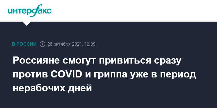 Москва. 26 октября. INTERFAX.RU - Граждане России смогут одновременно получить прививки от коронавируса и гриппа уже в предстоящие нерабочие дни, сообщил во вторник главный внештатный специалист по инфекционным болезням Минздрава РФ, профессор Владимир Чуланов.