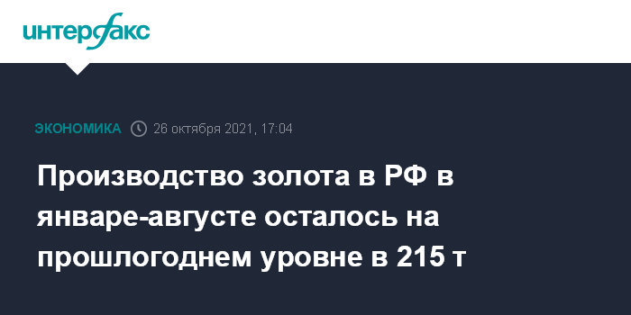Москва. 26 октября. INTERFAX.RU - Производство золота в России в январе-августе 2021 года составило 215,07 тонны. Об этом сообщил Минфин со ссылкой на данные о поставках сырья на российские аффинажные заводы.