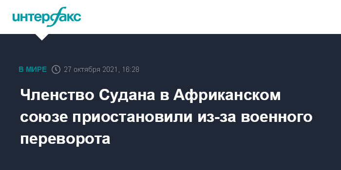 Москва. 27 октября. INTERFAX.RU - Африканский союз приостановил членство Судана в этой международной организации до тех пор, пока в стране не будет восстановлено гражданское правление, сообщают в среду западные СМИ.