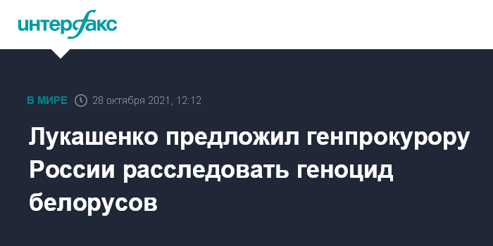 Москва. 28 октября. INTERFAX.RU - Президент Белоруссии Александр Лукашенко на встрече с генпрокурором России Игорем Красновым попросил его лично подключиться к расследованию фактов геноцида белорусского и советского народа в годы Великой Отечественной войны. Об этом сообщает "БелТА".