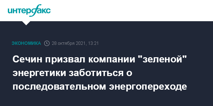 Москва. 28 октября. INTERFAX.RU - Компании "зеленой" энергетики должны заботиться не столько о быстром росте капитализации за счет увеличения цен для потребителей, сколько об обеспечении последовательного энергетического перехода, не создающего шоков для экономики и потребителей, которых с начала пандемии и так было достаточно, заявил глава "Роснефти" Игорь Сечин на XIV Евразийском экономическом форуме.