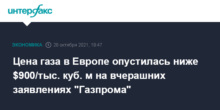 Цена газа в Европе опустилась ниже $900/тыс. куб. м на вчерашних заявлениях "Газпрома"