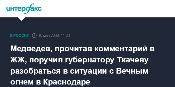 Медведев, прочитав комментарий в ЖЖ, поручил губернатору Ткачеву разобраться в ситуации с Вечным огнем в Краснодаре