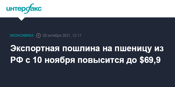 Москва. 29 октября. INTERFAX.RU - Экспортная пошлина на пшеницу из РФ с 10 ноября повысится до $69,9 с $67 за тонну, сообщил Минсельхоз.