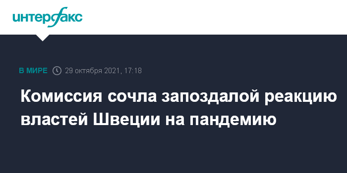 Москва. 29 октября. INTERFAX.RU - В Швеции комиссия, которая расследовала реакцию правительства на пандемию, пришла к выводу, что чиновники реагировали на вызовы с опозданием и мер профилактики и контроля, принятых на первой стадии, было недостаточно, чтобы предотвратить или хотя бы ограничить распространение вируса, пишет Guardian.