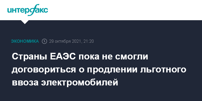 Москва. 29 октября. INTERFAX.RU - Обсуждение продления беспошлинного ввоза электромобилей на территорию Евразийского экономического союза (ЕАЭС) отложено на более поздний срок. В пятницу участники Совета Евразийской экономической комиссии (ЕЭК) не смогли прийти к согласованной позиции по этому вопросу. Об этом сообщили "Интерфаксу" два источника, знакомых с итогами заседания.