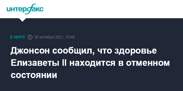 Москва. 30 октября. INTERFAX.RU - У королевы Великобритании Елизаветы II нет каких-либо серьезных проблем со здоровьем, заявил в субботу британский премьер Борис Джонсон.