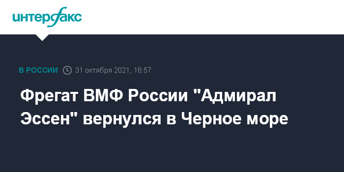 Москва. 31 октября. INTERFAX.RU - Российский фрегат "Адмирал Эссен", оснащенный крылатыми ракетами большой дальности "Калибр", в воскресенье после 85-дневного пребывания в Средиземноморье вернулся в акваторию Черного моря, сообщили в соцсетях стамбульские наблюдатели, публикующие фотографии его прохождения через проливы.
