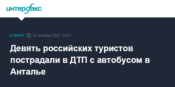 Москва. 31 октября. INTERFAX.RU - Девять российских туристов пострадали в аварии с туристическим автобусом в турецком городе Серик (провинция Анталья), среди них есть дети, сообщает в воскресенье Генконсульство РФ в Анталье.