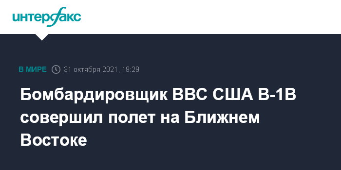 Москва. 31 октября. INTERFAX.RU - Американский стратегический бомбардировщик B-1B Lancer выполнил "патрульную миссию" на Ближнем Востоке, сообщило Центральное командование Вооруженных сил США.