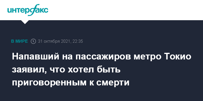 Москва. 31 октября. INTERFAX.RU - Мужчина, который 31 октября напал с ножом на пассажиров и устроил пожар в токийском метро, признался полицейским, что "хотел убить людей и получить смертный приговор", сообщает агентство Kyodo.