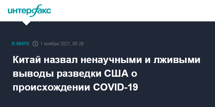 Москва. 1 ноября. INTERFAX.RU - Выводы о происхождении коронавируса, содержащиеся в рассекреченном докладе американского разведсообщества, недостоверны и ненаучны, заявил официальный представитель МИД КНР Ван Вэньбинь.