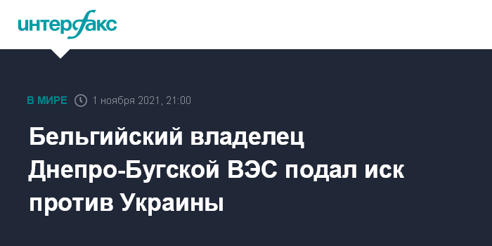 Москва. 1 ноября. INTERFAX.RU - Зарегистрированная в Бельгии акционерная компания Srew N.V., являющаяся владельцем 75% уставного капитала ООО "Днепро-Бугская ВЭС", инициировала арбитражное разбирательство против Украины.