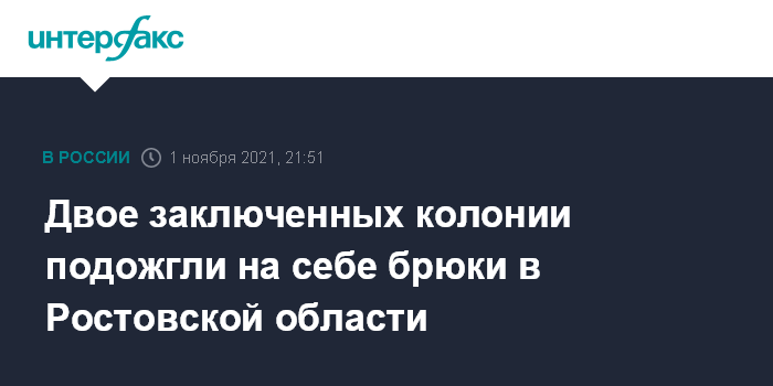 "Сегодня в исправительной колонии строгого режима №14 ГУФСИН по Ростовской области для лиц, ранее отбывавших наказание, двое осужденных после ужина забрались на крышу столовой и подожгли брюки, после чего самостоятельно их потушили", - говорится в сообщении пресс-бюро управления, поступившем в понедельник в "Интерфакс".