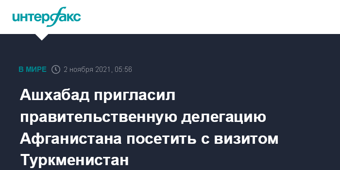 Москва. 2 ноября. INTERFAX.RU - Туркменская сторона пригласила правительственную делегацию Афганистана посетить с визитом Туркменистан, сообщает сайт внешнеполитического ведомства Туркменистана в пресс-релизе об итогах рабочего визита туркменской делегации во главе с вице-премьером, министром иностранных дел Туркменистана Рашидом Мередовым в Кабул с 30 по 31 октября.
