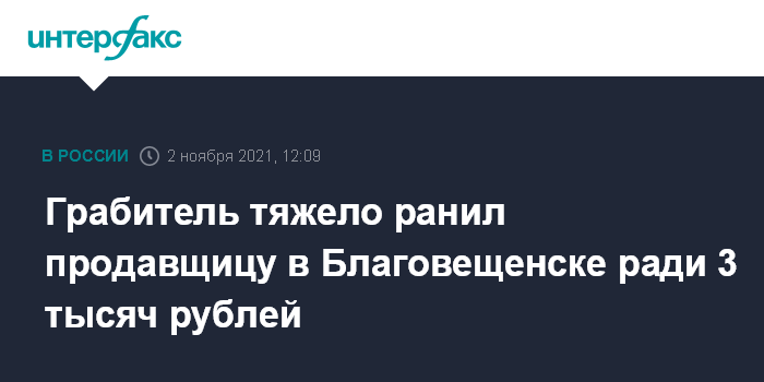 Москва. 2 ноября. INTERFAX.RU - В Благовещенске задержан подозреваемый в разбойном нападении на продавщицу круглосуточного магазина, сообщили в СК Амурской области. По версии следствия, он несколько раз ее ударил ножом и забрал из магазина 3000 рублей, немного водки и сигареты.