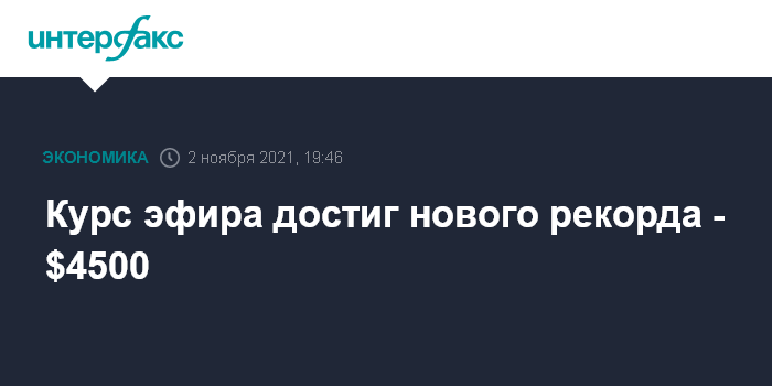 Москва. 2 ноября. INTERFAX.RU - Курс эфира (Ether), второй по капитализации криптовалюты после биткойна, обновил рекорд, поднявшись выше отметки в $4500.