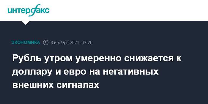 По мнению экспертов "Интерфакс-ЦЭА", рубль умеренно слабеет к доллару и евро на старте торгов 3 ноября на фоне негативных сигналов, поступающих с мировых рынков капитала. Нефтяные котировки продолжают снижаться накануне заседания ОПЕК+, которое состоится в четверг, 4 ноября. Кроме того, инвесторы снизили аппетит к рисковым активам в ожидании итогов двухдневного заседания Федеральной резервной системы (ФРС) США.