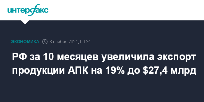 Москва. 3 ноября. INTERFAX.RU - Россия за 10 месяцев этого года экспортировала продукции АПК на $27,352 млрд, что на 19% превышает показатель за аналогичный период прошлого года, сообщил центр "Агроэкспорт" при Минсельхозе.