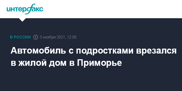 Москва. 3 ноября. INTERFAX.RU - Полиция в Приморье проводит проверку по факту аварии, в которой один подросток погиб, еще четыре человека, в том числе трое несовершеннолетних, пострадали. Об этом сообщила пресс-служба краевого УМВД.