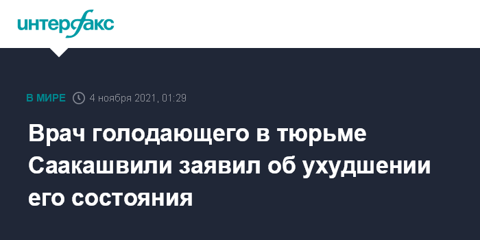 Москва. 4 ноября. INTERFAX.RU - Состояние здоровья бывшего президента Грузии Михаила Саакашвили, продолжающего голодовку в Руставской тюрьме, ухудшается, он потерял 10% своего веса, заявил его личный врач Николоз Кипшидзе.