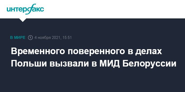 Москва. 4 ноября. INTERFAX.RU - В МИД Белоруссии в четверг вызван временный поверенный в делах Польши, ему заявили протест в связи с распространенной Варшавой информацией об инциденте на границе.