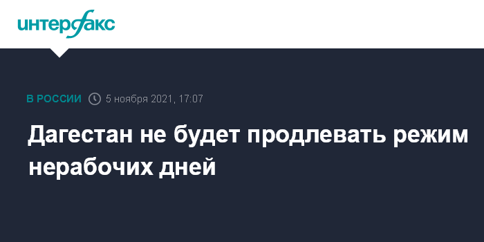 Москва. 5 ноября. INTERFAX.RU - Власти Дагестана не будут продлевать режим нерабочих дней после 7 ноября, сообщили "Интерфаксу" в пятницу в пресс-службе правительства региона.