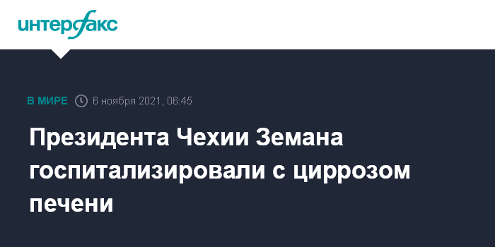 Москва. 6 ноября. INTERFAX.RU - Президент Чехии Милош Земан госпитализирован с циррозом печени, сообщило в пятницу чешское информационное агентство ČTK со ссылкой на члена консилиума врачей хирурга Павла Пафко.