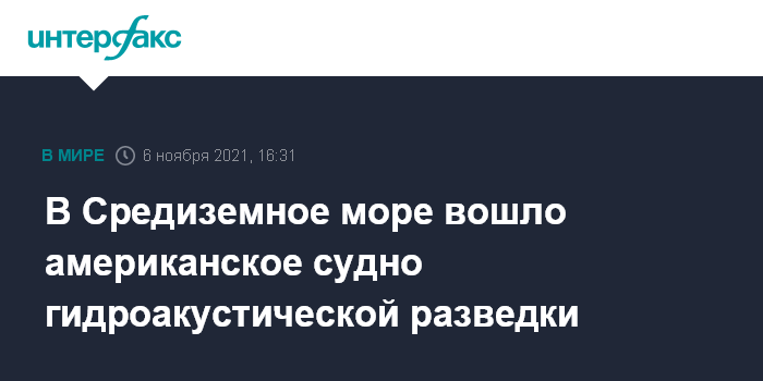 Москва. 6 ноября. INTERFAX.RU - Американское судно HOS Red Rock, которое используется ВМС США в качестве носителя опытовой системы гидроакустической разведки SURTASS-E, зашло в акваторию Средиземного моря, следует из данных международной системы слежения за кораблями (AIS).