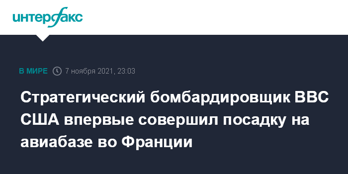 Москва. 7 ноября. INTERFAX.RU - Американский стратегический бомбардировщик B-1B Lancer в ходе выполнения полета над Европой впервые совершил посадку на авиабазе во Франции, следует из сообщения французских ВВС.