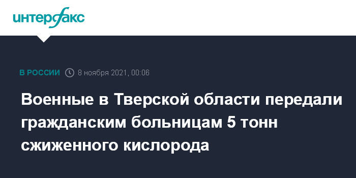 Москва. 8 ноября. INTERFAX.RU - Тверское соединение военно-транспортной авиации помогает гражданским больницам региона в условиях нехватки сжиженного кислорода, сообщили в Минобороны РФ в понедельник.