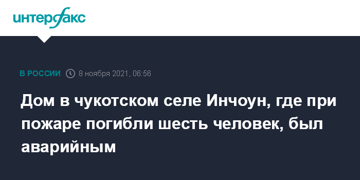 Как сообщалось, 29 октября в селе Инчоун Чукотского района произошёл пожар в одноэтажном жилом доме, в результате чего погибли четверо детей в возрасте от одного года до шести лет и две женщины 49 лет.