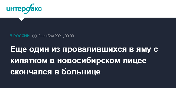 Москва. 8 ноября. INTERFAX.RU - Еще один из троих мужчин, устранявших утечку в системе отопления новосибирского лицея и провалившихся в яму с кипятком, скончался, сообщили "Интерфаксу" в Новосибирской областной клинической больнице.
