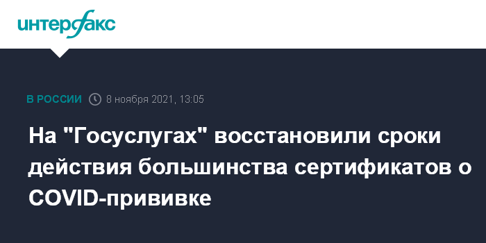 Москва. 8 ноября. INTERFAX.RU - Большинству пользователей портала Госуслуг восстановили сроки действия сертификатов о вакцинации от COVID-19, которые в понедельник были сокращены вдвое, сообщил замглавы Минцифры Олег Качанов.