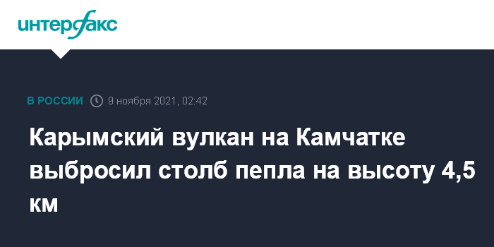 Москва. 9 ноября. INTERFAX.RU - Вулкан Карымский на Камчатке во вторник утром выбросил столб пепла на высоту до 4 тыс. 500 м над уровнем моря, сообщила Камчатская группа реагирования на вулканические извержения (KVERT) Института вулканологии и сейсмологии Дальневосточного отделения РАН.