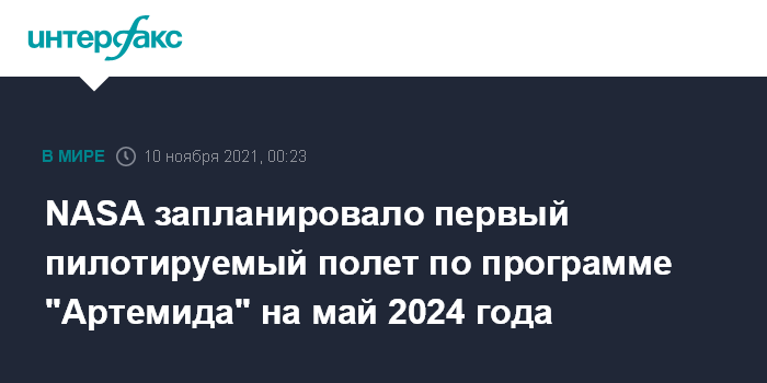 Москва. 10 ноября. INTERFAX.RU - Первый испытательный полет с экипажем на борту в рамках программы "Артемида" (Artemis) произойдет в мае 2024 года, заявил администратор NASA Билл Нельсон.