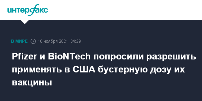 Москва. 10 ноября. INTERFAX.RU - Компании Pfizer и BioNTech подали запрос в Управление по санитарному надзору за качеством пищевых продуктов и медикаментов (FDA) о разрешении применения бустерной дозы их вакцины против коронавируса для американцев старше 18 лет.