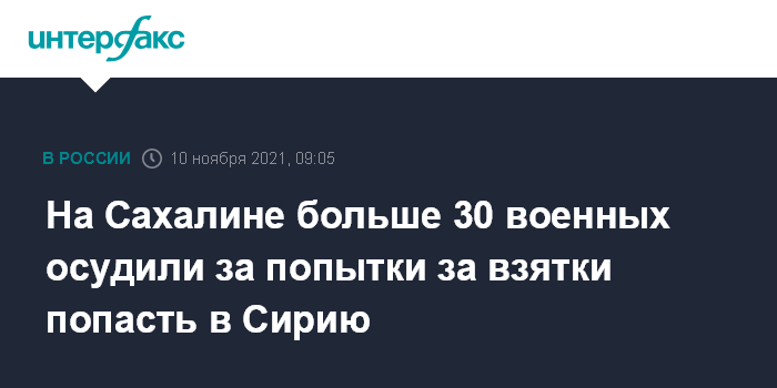 Москва. 10 ноября. INTERFAX.RU - В Сахалинской области суды оштрафовали больше трех десятков военных за попытку за взятки добиться отправки в Сирию, пишет "Коммерсантъ". По данным следствия и судов, взятки они передавали военному юристу Ивану Жаркову, но в Сирию так и не попали.
